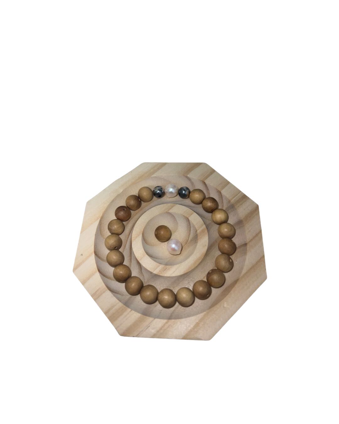 ウッドビーズにインドマイソール地方のサンダルウッドを使用し、アクセントビーズにはアコヤ真珠を1粒をナバホパールで挟み男性が着けやす様に仕上げました