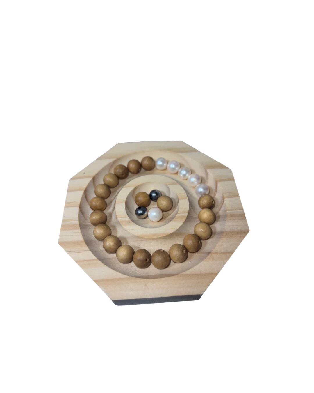 アコヤパール7.5mmを8粒使用、パールのみだと女性っぽさが出てしまう為ロンデルにバリシルバーのロンデルを使い、 ナバホパールビーズ5粒を連使いし、サンダルウッドにて柔らかさを出させていただきました
