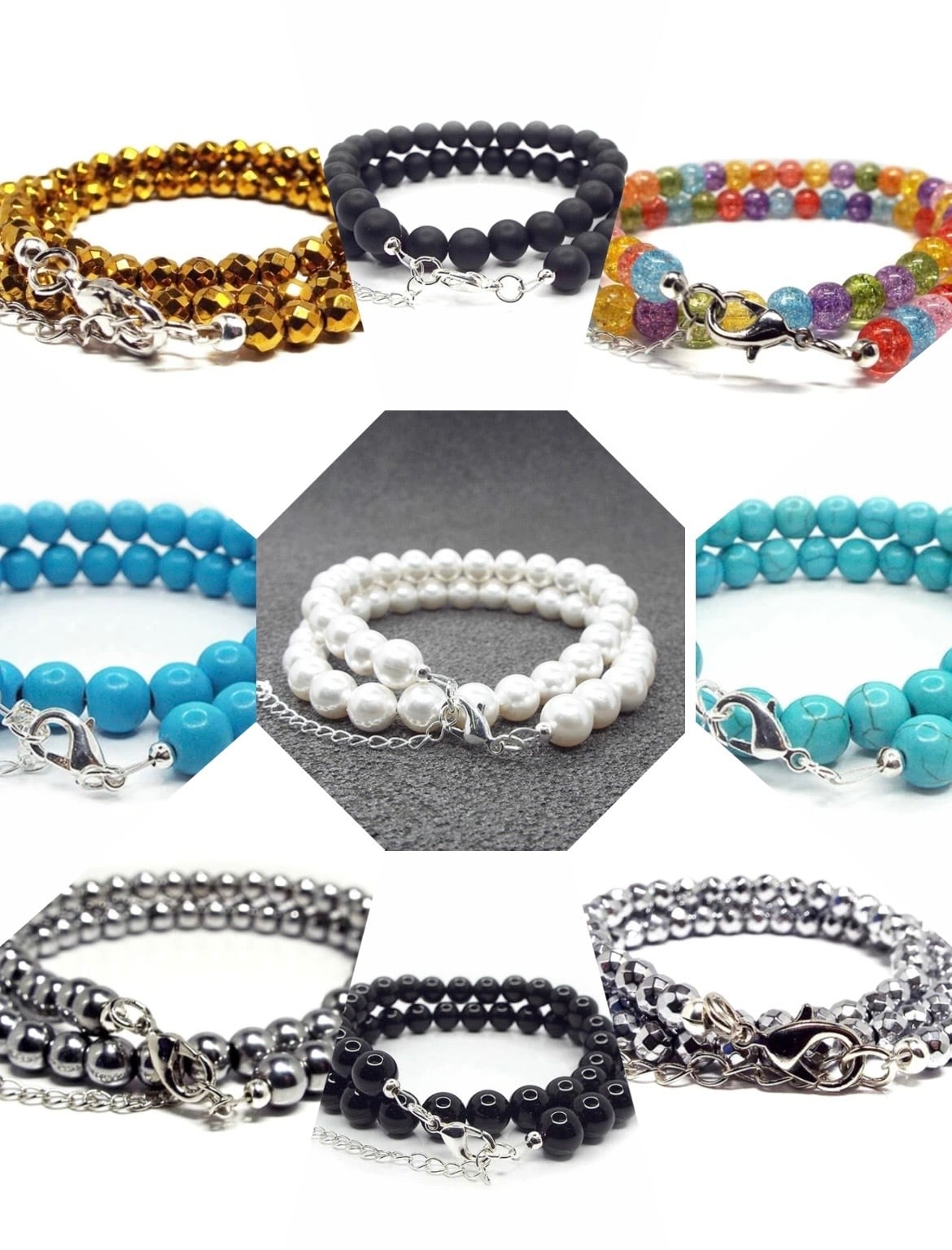 シェルパール、オニキス、マットオニキス、ブルーターコイズ、線入りターコイズ、ヘマタイト、カラフルクラック水晶、シルバーヘマタイト、ラウンドカットヘマタイト(シルバー、ゴールド)